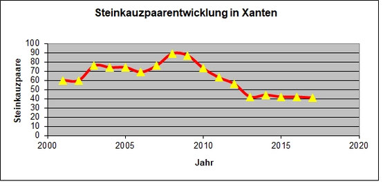 Leider ist die Steinkauzdichte in Xanten rapide nach unten gegangen. Nach einer alten Erhebung hatten wir 1990 ca. 60 Paare in Xanten. In 2003 waren es auch 60 Paare. In 2009 hatten wir den höchsten Stand mit 86 Paaren. Leider sind auch die letzten Jahre, trotz warmer Winter, nicht besser geworden. Wir können den Rückgang nur so begründen: Die Landwirtschaft stellte ihre Milchviehhaltung immer stärker auf 24 Stunden Viehaltung im Stall um. Die Wiesen werden dadurch nur noch zur Heuherstellung benutzt. Da findet der Steinkauz keine Nahrung mehr. Auch die gesamte Artenvielfalt leidet darunter sehr.